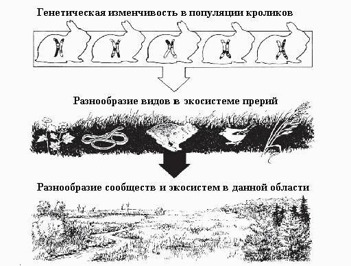Выделяется генетическое (разнообразие генов и их аллелей), видовое (разнообразие видов в экосистемах) и экосистемное разнообразие (разнообразие самих экосистем). Соответственно, процессы изменения генофонда и видообразования, циклы в сообществах и их сукцессии характеризуются разным откликом на внешние воздействия.