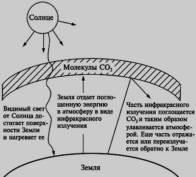 Механизм парникового эффекта заключается в следующем. Земля находится под воздействием потока излучения Солнца (основной энергетический вклад в поток космического излучения дает Солнце). Атмосфера Земли, ее поверхность частично отражают падающее излучение, частично — поглощают. Поглощение энергии вызывает нагрев земной поверхности. Ее сред¬няя температура составляет около 300К. Нагретая Зем¬ля также излучает, но, так как ее температура намного ниже солнечной, основное излучение энергии происходит на частотах инфракрас¬ного диапазона. Часть этого излучения поглощается парниковыми газами атмосферы. Часть излучения, достигающего поверхности Земли, возвращается в атмосферу. Ее количество зависит от альбедо (отражающей способности).