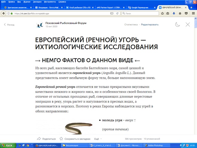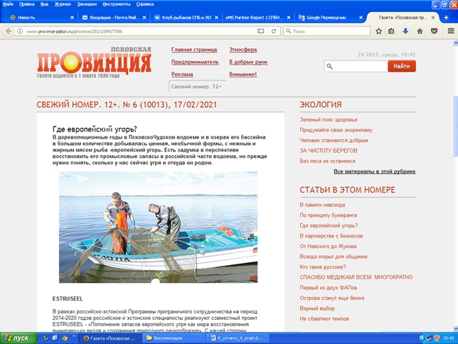 Несмотря на ряд ограниченийдля очных контактов из-за Ковид-19, российской команде исполнителей проекта удалось пообщаться с рыбаками-профессионалами как в Ленинградской, так и в Псковской областях, по результатам проведенных на тот момент исследований сделать обновленную презентацию и провести беседыо ходе выполнения российско-эстонского проекта по изучению угря бассейна р. Нарвы.