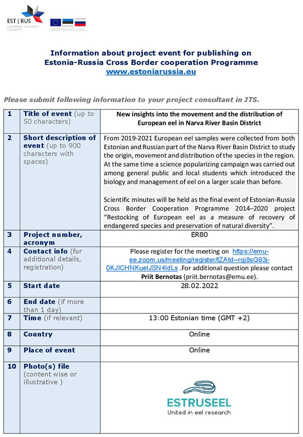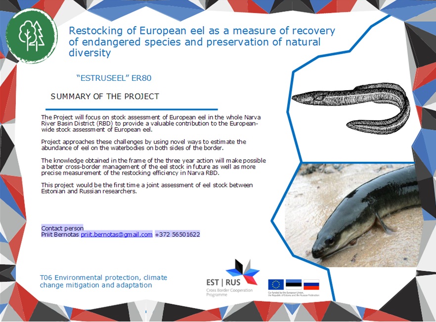 The project materials have been prepared for the popular-scientific publication as well as for the local newspaper in Russia and newspapers and magazine in Estonia. The website of the ESTRUSEEL project has been developed at the platform of Scientific Center during the second period of the project (https://spbrc.ru/ru/er80). In English the project ESTRUSEEL Twitter account https://twitter.com/estruseel is online and has 54 followers. There was two workshops targeted directly to school pupils and teachers of the schools located by lakes and rivers of Narva RBD in Estonia during the 2nd project period: one in Jõhvigümnaasium (22.01.2020) and in Tartu Tammekool (17.02.2020) where project manager PriitBernotas introduced to school pupils and teachers project ESTRUSSEL and eel research in general. School pupils of the school located by the Narva River basin participated at the two workshops, which were held in the school of the city of Ivangorod at February 28 and 29, 2020. The total number of participants were more than 75 persons.
