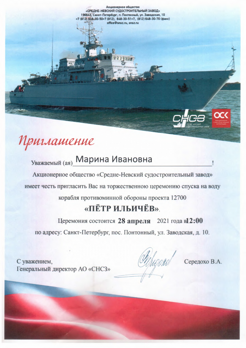 План мероприятия: участие в торжественной части, экскурсия по кораблю и цехам завода.