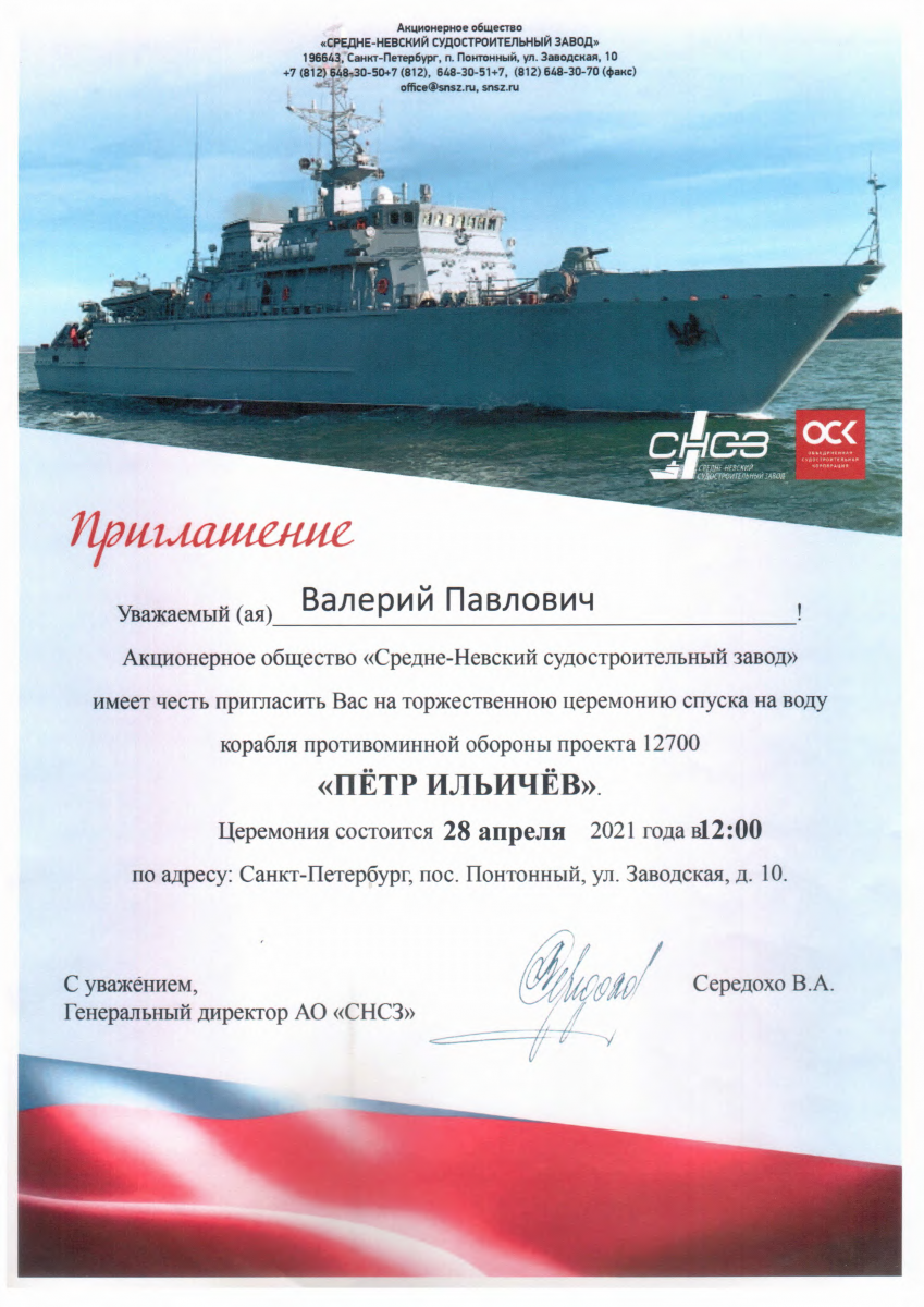 ЦАМТО, 28 апреля 2021 г. Корабль противоминной обороны «Петр Ильичев» проекта 12700, строящийся для ВМФ РФ, 28 апреля спущен на воду на Средне-Невском судостроительном заводе (входит в АО «ОСК»), передает «РИА Новости».