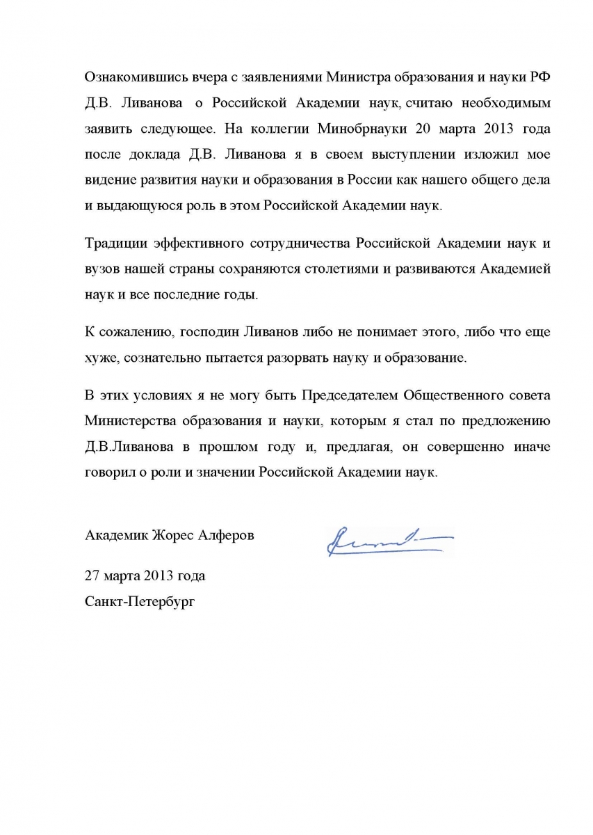 Заявление вице-президента РАН, председателя СПбНЦ РАН, академика Ж.И.Алферова
